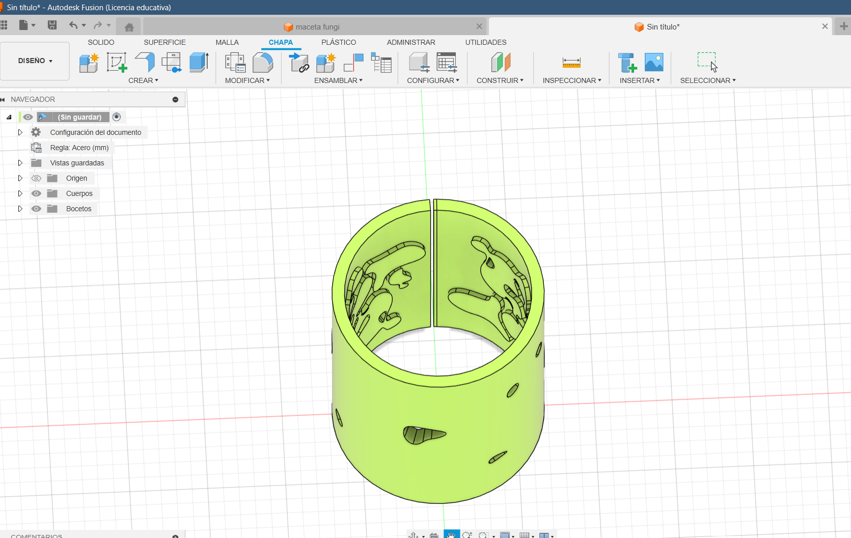 Entonces, armé el cilindro a partir de un cículo pero luego le dejé una mínima abertura, luego usé las herramientas de chapa para darle grosor y poder desplegarlo: