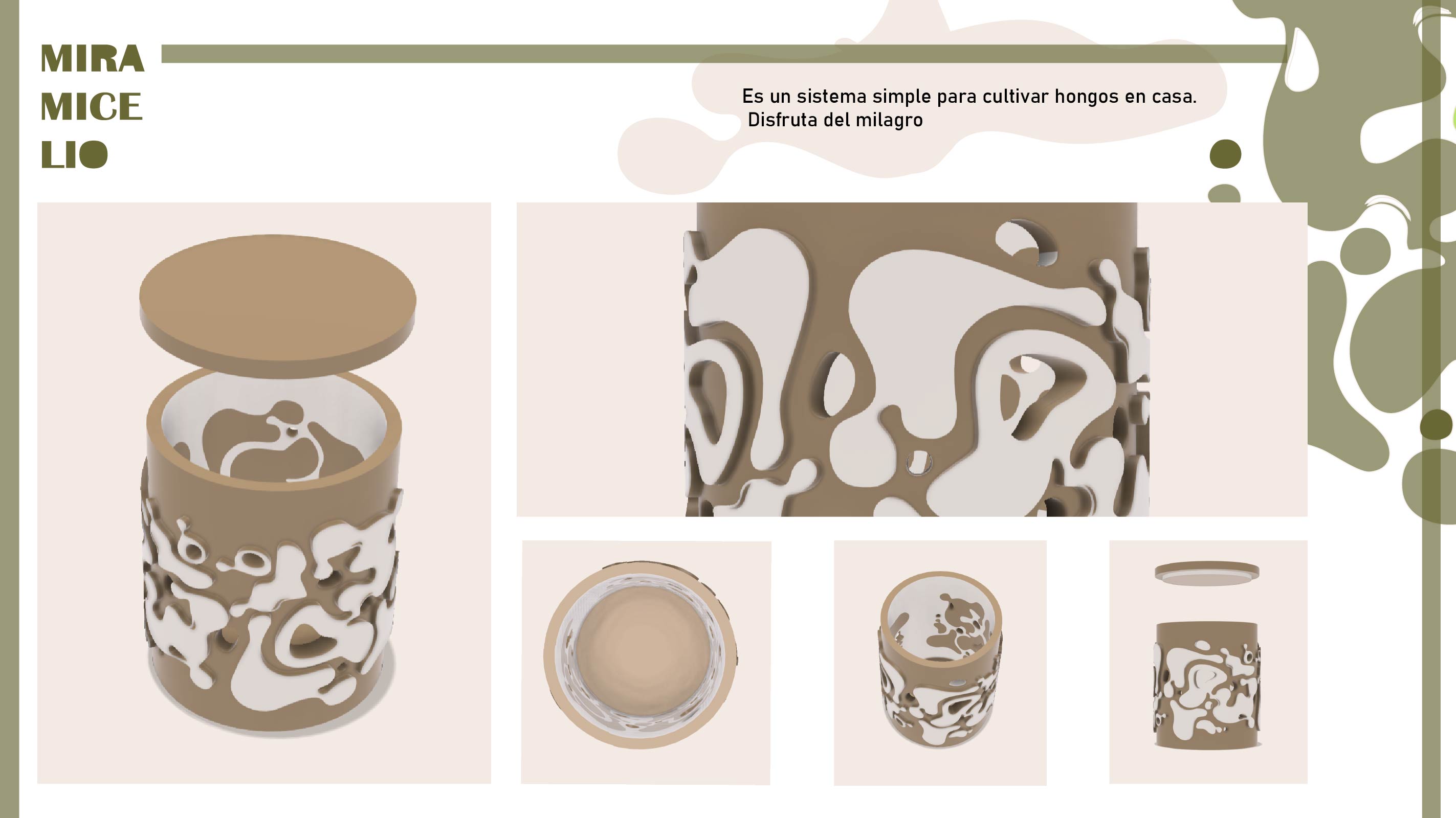 El producto es un sistema simple de cultivo de hongos, se coloca el sustrato inoculado con las esporas de hongos y los hongos fructificarían por los huecos que tiene el contenedor.