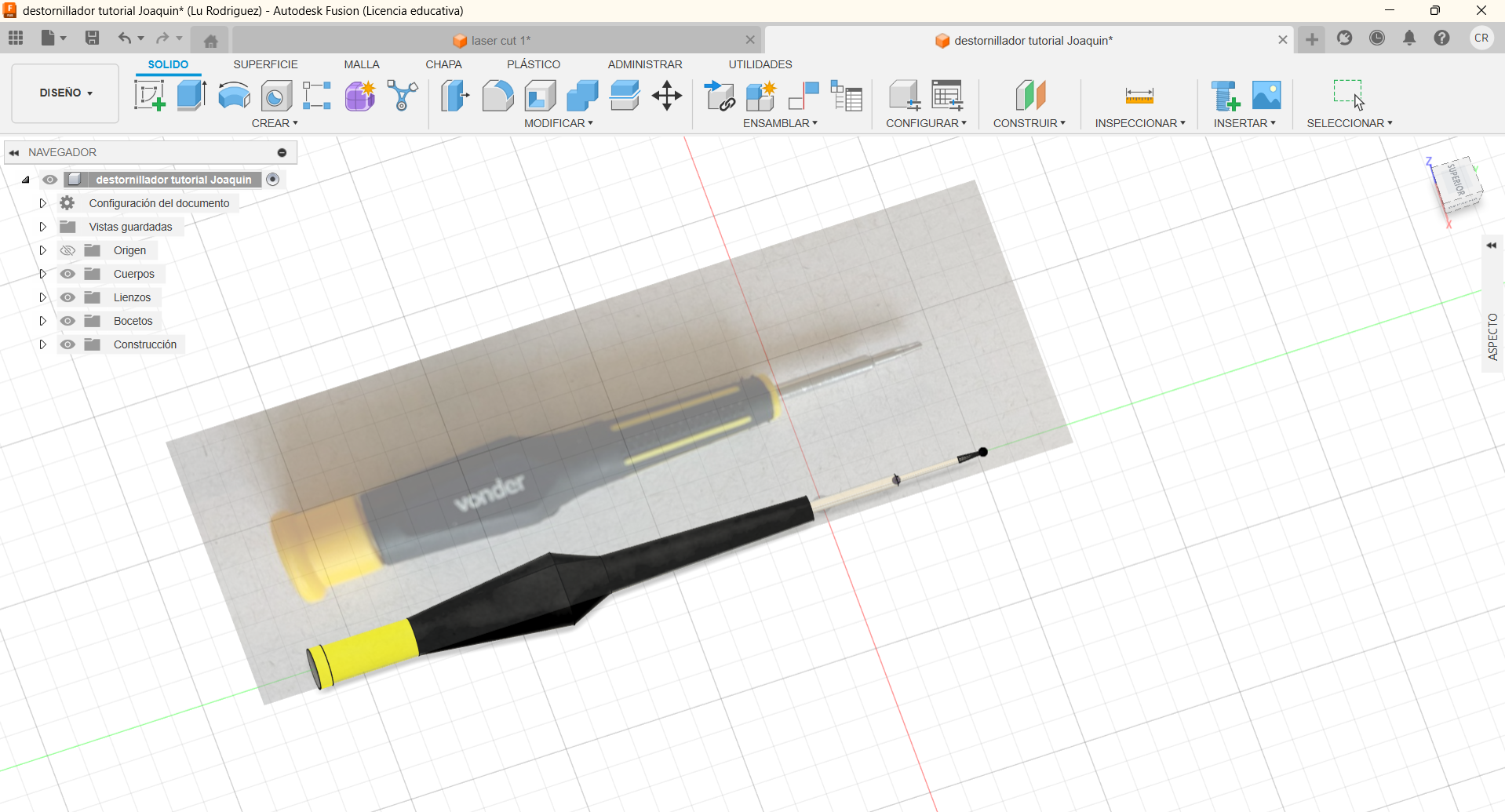 Tuve algo más de tiempo y para practicar un poco trabajé con el tutorial que encontré en moodle. Joaquín nos guía paso a paso para trabajar con el modelado de un objeto, trabajamos en diferentes planos, facetando el objeto en donde se modifica la forma. Mi destornillador era muy pequeño y no tenía un calibre muy exacto pero fui aplicando las herramientas aprendidas.